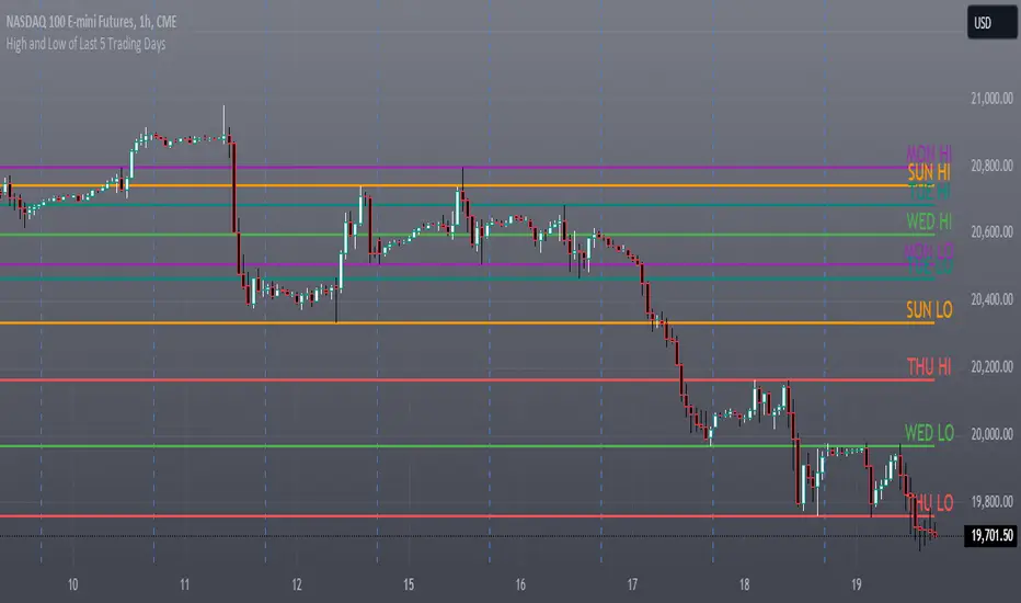 This indicator plots the high and low levels for each of the last 5 trading days on your TradingView chart. It helps traders to visualize important price levels from the recent trading history, which can act as potential support and resistance levels.