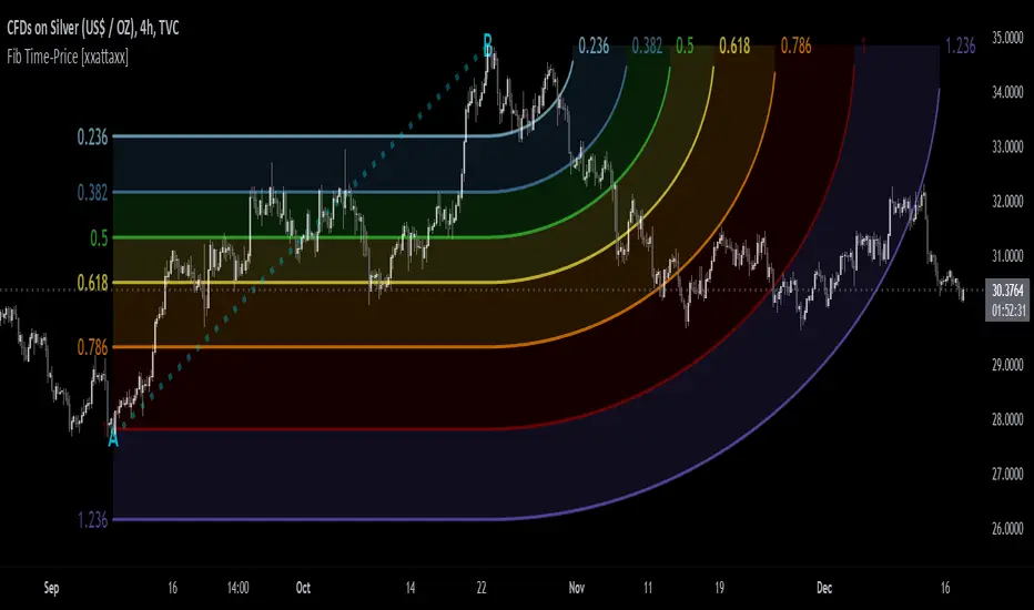 🟩 Fibonacci Time-Price Zones is a chart visualization tool that combines Fibonacci ratios with time-based and price-based geometry to analyze market behavior. Unlike typical Fibonacci indicators that focus solely on horizontal price levels, this indicator incorporates time into the analysis, providing a more dynamic perspective on price action.