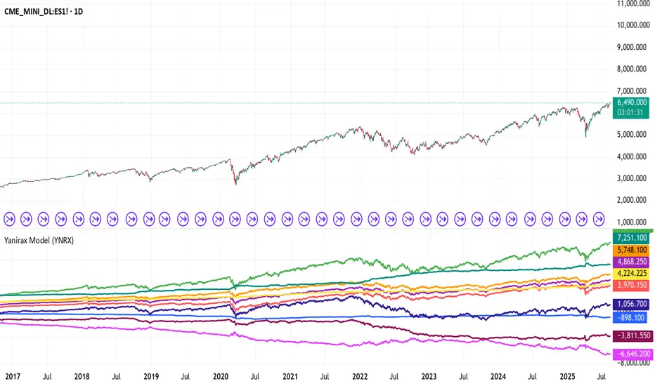 The Yanirax Model (YNRX) is a quantitative analysis tool designed to detect market lows and highs for a multitude of financial assets. This script calculates and accumulates (cumulative computation) a series of metrics in both absolute values and logarithmic percentages, allowing patterns to be identified that detect market highs and lows.