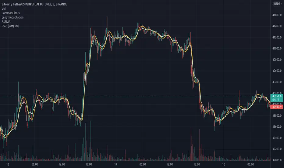 In this script, I try to get the best of all these approaches and present to you Relative Strength Super Smoother. It uses RS EMA algorithm to calculate the SuperSmoother length. Unlike the original RS EMA algorithm, that has an abstract "multiplier" setting to scale the period variance (without this parameter, RSI would only allow it to speed up twice; Vitaly Apirine sets the multiplier to 10 by default), my implementation has explicit lower bound setting, so you can specify the exact range of calculated length.