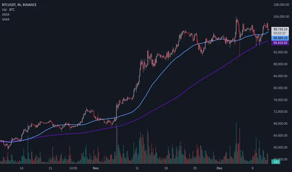 The Adaptive Moving Average (AMA) script is designed to calculate and plot a moving average that adapts dynamically based on market conditions. This script uses pivot-based periods for its calculation, allowing it to adjust its behavior in response to market volatility and trends. It supports both Simple Moving Average (SMA) and Exponential Moving Average (EMA).