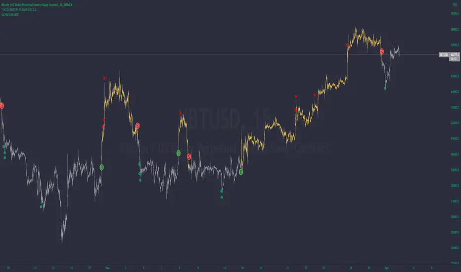 The Quantum Trader was designed to be used with Heikin Ashi candles on 3H chart. Indicator uses security function for profit points so alerts will give a warning