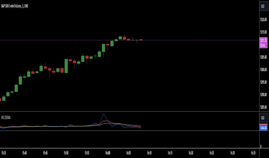 The "Volume Range Dual EMA" indicator is a technical analysis tool designed for TradingView charts. It calculates the ratio of volume to the price range of each bar and plots two Exponential Moving Averages (EMAs) of this ratio.