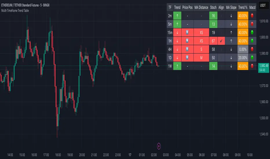 A powerful multi-timeframe trend dashboard that combines EMA alignment, stochastic signals, MA proximity, and momentum strength into a compact, customizable table. Ideal for traders looking to identify high-confluence entry zones across intraday and higher timeframes.