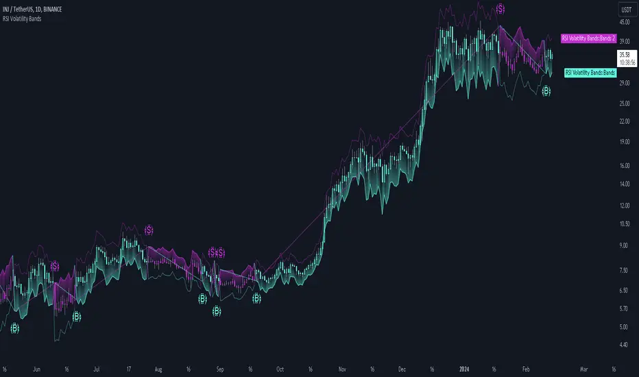 The RSI Volatility Bands indicator introduces a unique approach to market analysis by combining the traditional Relative Strength Index (RSI) with dynamic, volatility adjusted deviation bands. It is designed to provide a highly customizable method of trend analysis, enabling investors to analyze potential entry and exit points in a new and profound way.
