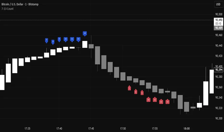 This indicator displays a sequential count (7-13) setup phase. It tracks consecutive bars where the close is lower than the close 4 bars ago (bullish/buy count, labeled below bars) or higher (bearish/sell count, labeled above bars), resetting on interruption or after 13. Toggle individual numbers (I personally use 7,9,13) and customize bullish/bearish label colors to spot potential trend exhaustion and reversal points.