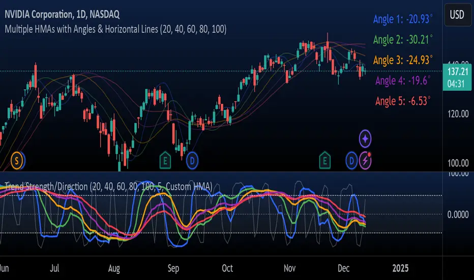 6 angles, each of a different time frame are used to represent direction and trend strength. Angles are used because they intrinsically represent momentum and speed. An angle of 45 represents a perfect balance between something that can cover the furthest distance without compensating for speed. 1 of the 6 angles is intended(though customizable) to represent the 5 hma's angle. This is because the 5hma is very good at representing very near term price action.