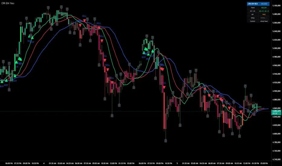 CRR Bill Williams Neo System is an educational chart overlay that combines classic Bill Williams concepts into a single visual framework.