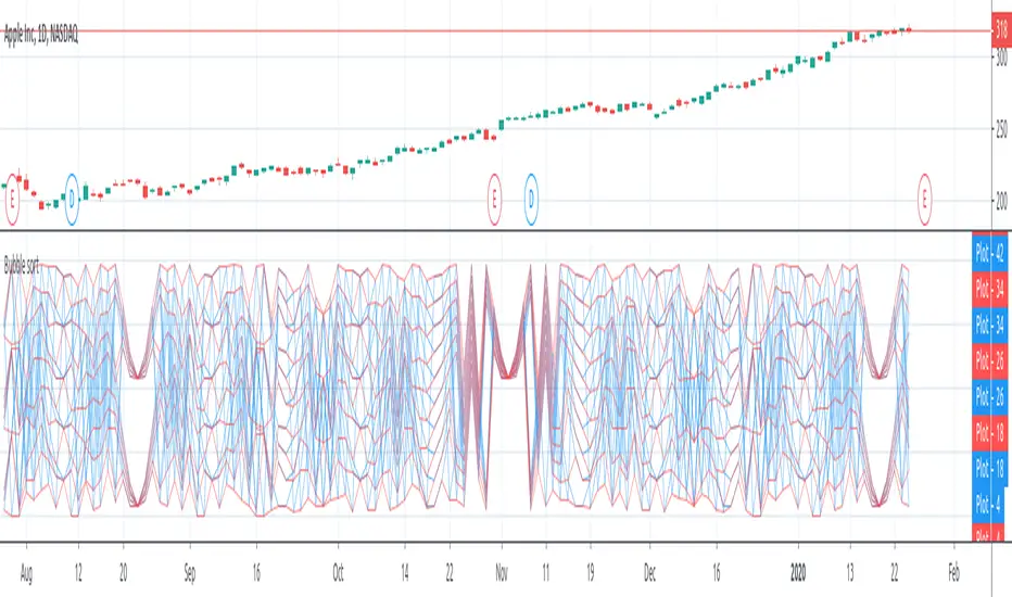 The script also shows an example of implementation of bubble sort of the array in pine: when the array have been created, it's filled with pseudo-random numbers and sorted on every bar. There are plotting of the array's numbers before/after soring to show the sorting result.