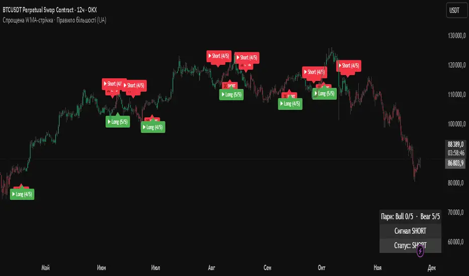 This strategy is a simplified WMA-ribbon “majority rule” system. It compares five fast WMAs (10–30) with five slow WMAs (70–90) and counts how many bullish or bearish pairs are strongly separated by a small ε-buffer. A long (short) position is opened only when a bullish (bearish) majority is reached and closed when that majority weakens or an opposite majority appears. Position size is calculated from a fixed USD amount and leverage, candles are colored by current position, and a mini dashboard shows the number of bullish/bearish pairs and the current status (LONG / SHORT / FLAT).