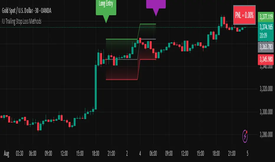 The 'IU Trailing Stop Loss Methods' it's a risk management tool which allows users to apply 12 trailing stop-loss (SL) methods for risk management of their trades and gives live alerts when the trailing Stop loss has hit. Below is a detailed explanation of each input and the working of the Script.