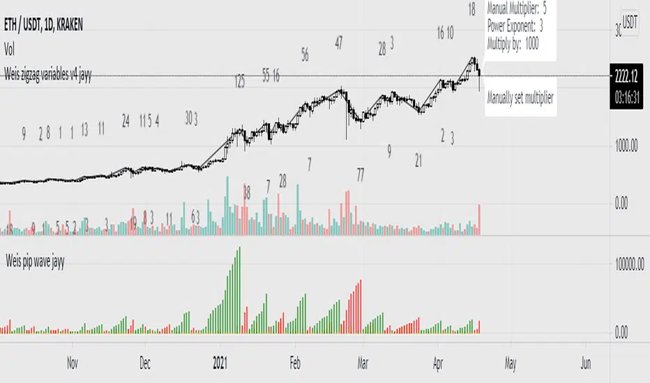 This is a minor script update to have the so-called "pip wave" plot correctly. The pip wave is "2" in the first dialogue box which gives the following options: choose 1 for weis cumulative volume, 2 for pip/price change for each weis wave, 3 for experimental wave time, 4 for volume/delta price or volume/delta pip1 is a cumulative volume for the selected wave size