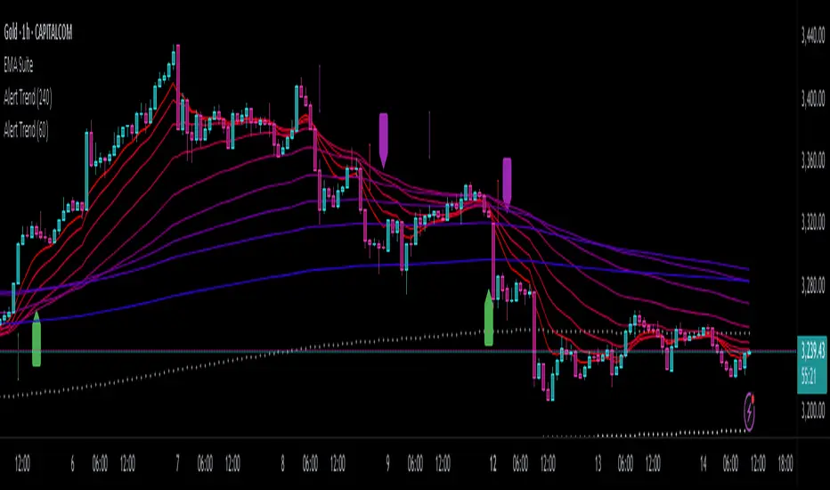 Personally, I pair it with the "EMA Suite" indicator, as my strategy revolves around Fibonacci-based moving averages. The indicator uses EMA 55 and EMA 233 as trend references, triggering a trend shift when a candle closes fully above or below these levels. To maintain structural integrity, the EMA values are not user-configurable in the settings: adjustments require direct script modification (e.g., switching to EMA 50 and EMA 200, widely recognized reference levels), this ensures logical consistency for advanced users familiar with Pine Script.