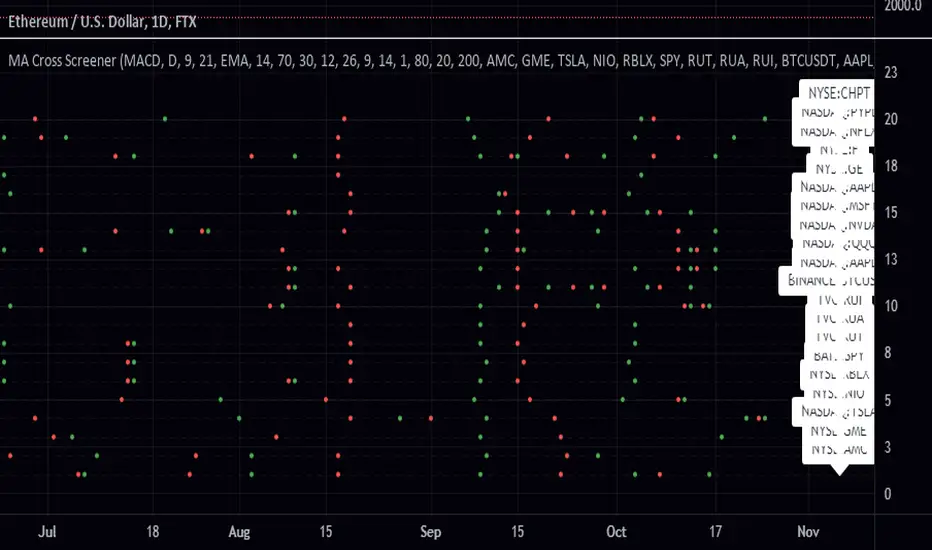 This script lets you pick 20 symbols to check for ma crosses. The way it works is it scans all 20 of your symbols for moving average crosses and then it sends an both a regular alert and a visual alert inside of the indicator. I found that ma cross strategies are very popular right now so I thought it would be nice to have one indicator instead of 20 discord servers. The features include: 20 custom symbols, alerts, custom colors, ma select, and custom time frames. If you want to use the custom time frame option, use the lowest time frame possible. That way you wont have gaps. If you have any comments please voice them, that includes suggestions!