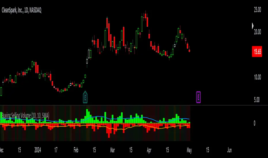This script is designed as a TradingView indicator called "Buying Selling Volume". It aims to provide insights into buying and selling pressures in the market, along with the comparison of these pressures against moving averages.