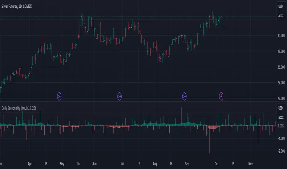 This indicator calculates average returns for trading days across specified number of years in the past and displays this as a histogram. In addition, it displays EMA of these values as filled area plot.