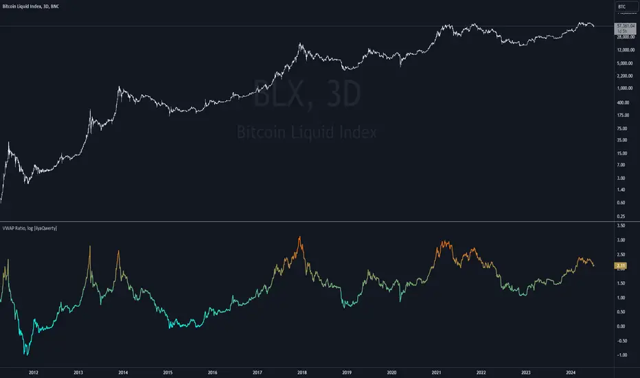 - BTC-Specific Optimization: Although the indicator can be applied to various assets, the VWAP Ratio indicator is particularly useful for Bitcoin (BTC) due to its significant trading volume and unique market behaviour.