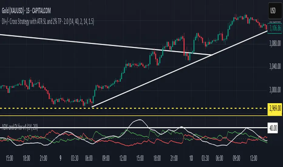This strategy is based on the directional movement of the market using the Average Directional Index (ADX) components — DI+ and DI- — to generate entry signals, with clearly defined risk and reward targets using ATR-based Stop Loss and Fixed Percentage Take Profit.