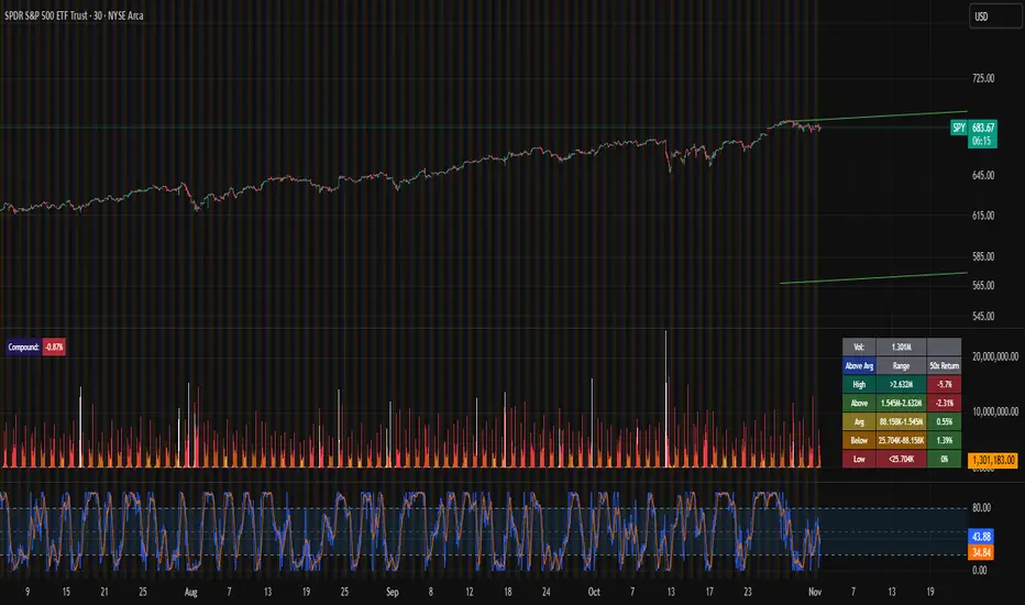 This indicator analyzes historical volume data and categorizes each trading period into one of six levels: Outlier, Low, Below Average, Average, Above Average, or High.