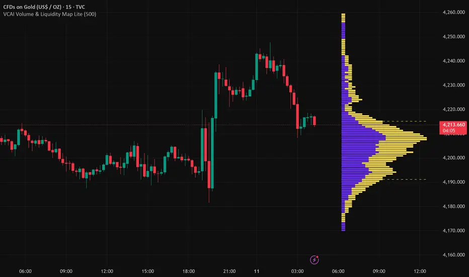 VCAI Volume & Liquidity Map Lite visualises recent market participation using a horizontal liquidity/volume histogram plotted beside current price.