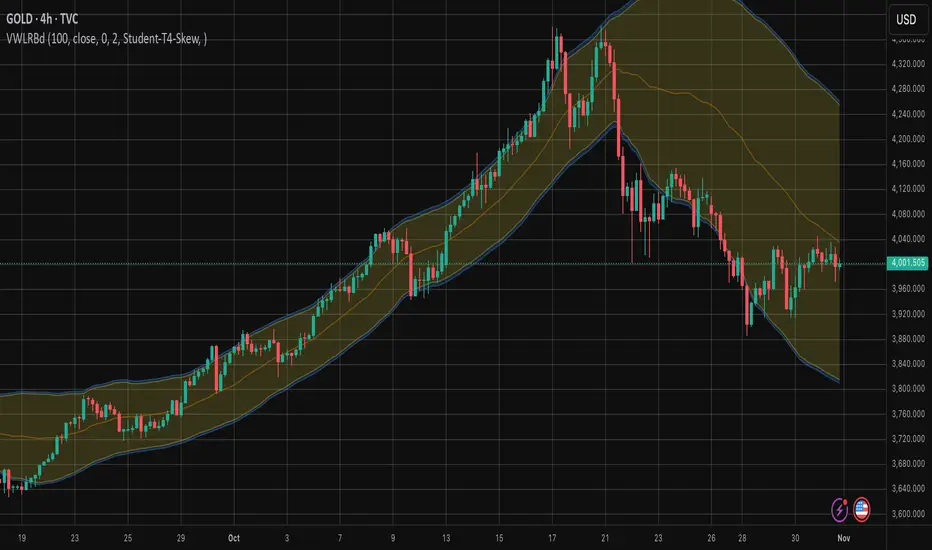 Regression Baseline (Linear / Exponential): The central line is a (Volume-Weighted) Linear Regression curve. An optional 'Normalize' mode performs all calculations in logarithmic space, transforming the baseline into an Exponential Regression Curve and the bands into constant percentage deviations, suitable for analyzing growth assets.