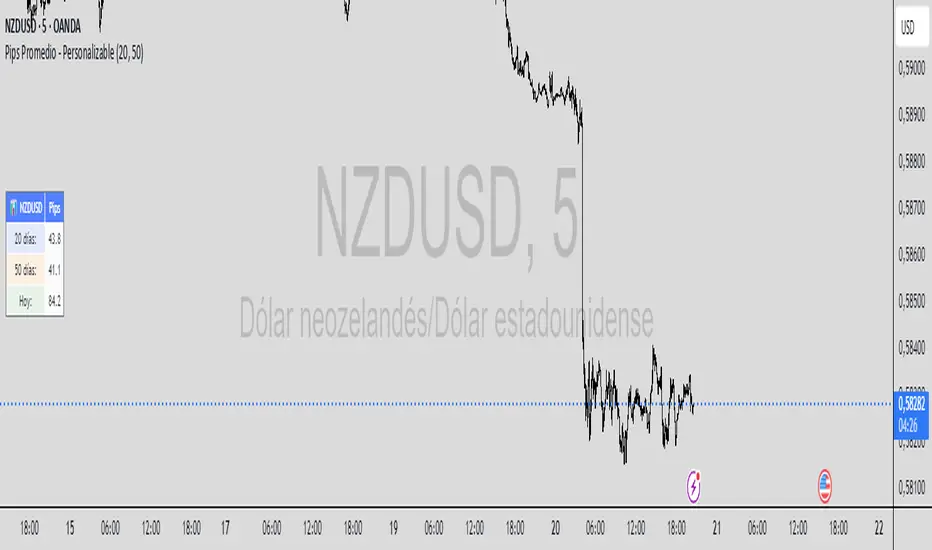 Muestra el promedio de pips de los ultimos 50 dias los ultimos 20 dias y lo que se ha movido en el dia en curso, es personalizable segun tu necesidad.