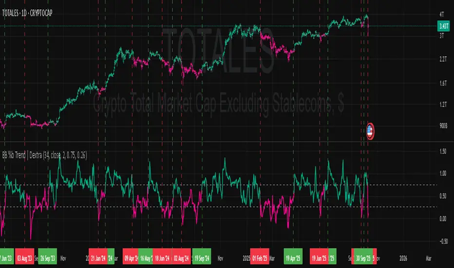The Bollinger Bands %b Trend | Dextra is a custom technical indicator designed to enhance trend identification using the Bollinger Bands %b concept. This indicator calculates the percentage position of the price relative to the Bollinger Bands and uses customizable thresholds to determine bullish or bearish trends. It integrates dynamic candle coloring and a clear visual representation to assist traders in making informed decisions.