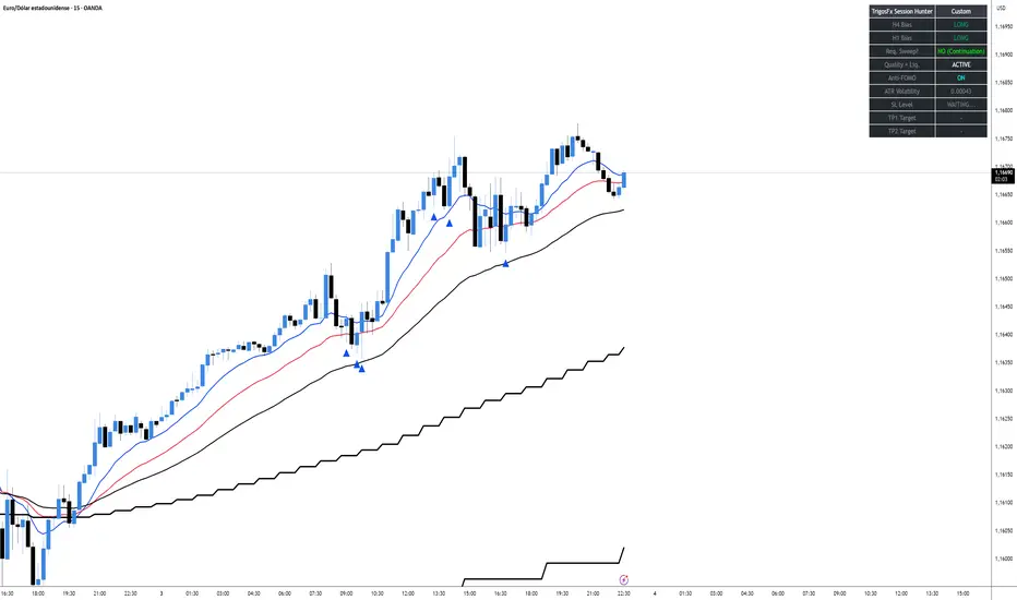 TrigosFx Session Hunter is a professional-grade trading suite designed to align with Institutional Order Flow and Smart Money Concepts (SMC). Optimized for XAUUSD (Gold) and major Forex pairs (EURUSD, GBPUSD), this tool removes market noise to identify high-probability entries during the London and New York sessions.