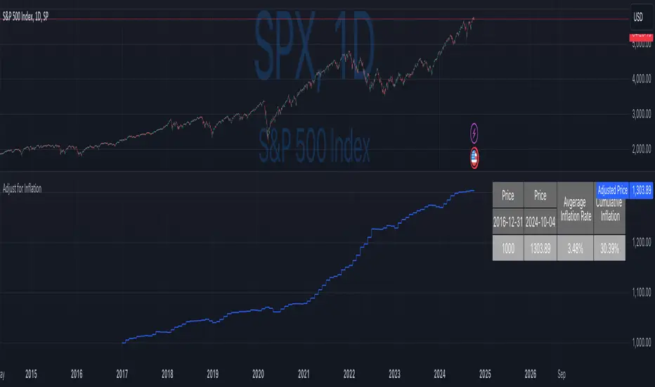 This indicator allows traders to adjust historical prices for inflation using customizable CPI data. The script computes the adjusted price by selecting a reference date, the original price, and the CPI source (US CPI or custom input) and plots it as a line on the chart. Additionally, a table summarizes the adjusted price values and average and total inflation rates.