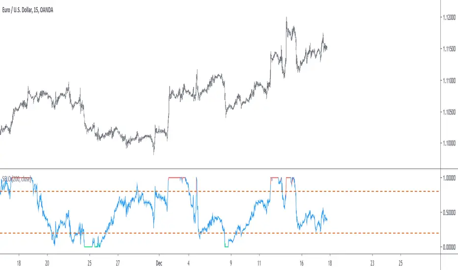When the indicator is equal to 1 or 0 there are high chances of reversals, more in depth this mean that the detrended price have crossed the highest/lowest of the forecast, when the indicator is equal to 0 or 1 for a long time this mean that the forecast was quite inaccurate, you can minimize risk by focusing on the cross between the detrended price and the 0.8/0.2 levels.