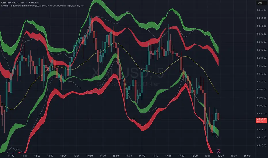 Multi Basis Bollinger Bands Pro is a volatility and trend-focused indicator using multiple Bollinger Bands with customizable moving average types (SMA, EMA, WMA) and sources.