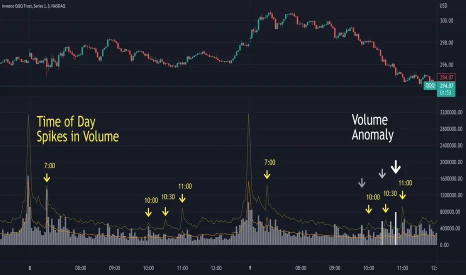 This volume indicator measures the volume for each bar at the time of day and displays the average and +1 standard deviation above that average.