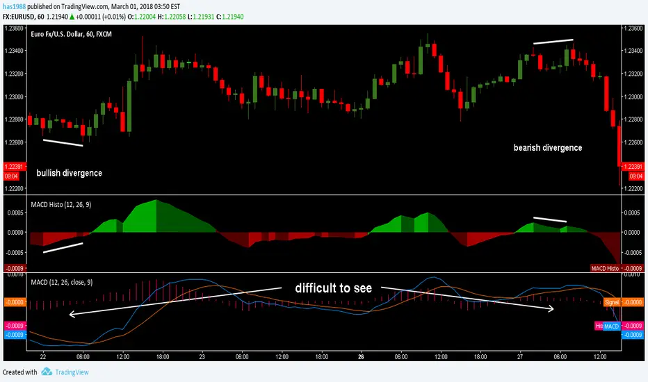 When I´m using the MACD, I´m just searching for a divergence between Price and the MACD-histogram. I´m not interested in the MACD-signalline or the MACD-line in any way. As you can see, The omission of them leads to better visualisation. It´s much easier to spot a divergence. On the one hand because that way the histogram scales bigger, on the other hand becauce the lines can´t overdraw the histogram.