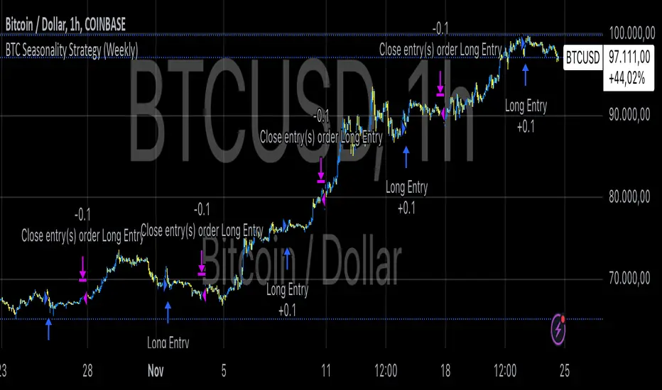 This strategy identifies potential weekend opportunities in Bitcoin (BTC) markets by leveraging the concept of seasonality, entering a position at a predefined time and day, and exiting at a specified time and day.