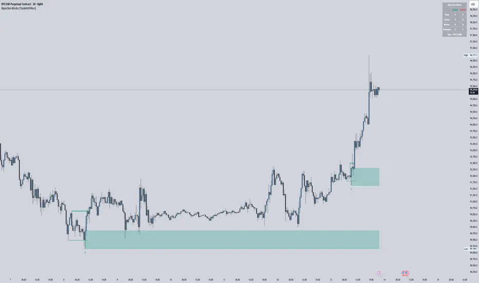 Rejection Blocks [TradeWithRon] is an advanced Swing Failure Pattern (SFP) + Rejection Block indicator designed to highlight institutional rejection zones, failed liquidity grabs, and high-probability reaction areas.