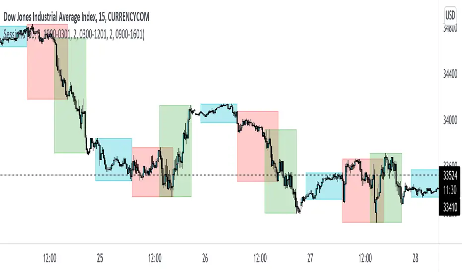 An indicator that displays each trading session. Each box represents a single session (Asian, London and NY) and their respective overlaps.