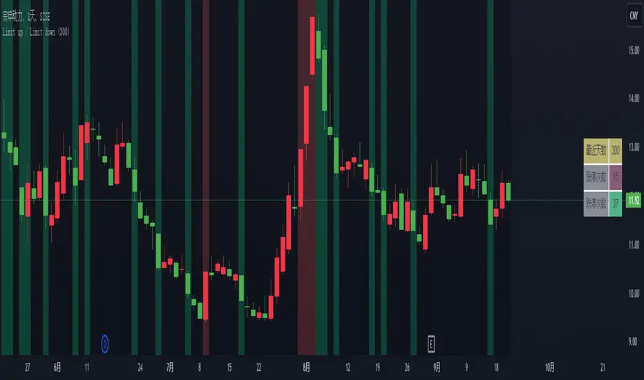 The price limit system in China’s stock market is a regulatory measure implemented by the Chinese securities authorities to curb excessive speculation. It refers to the maximum allowable daily price fluctuation of a stock, which cannot exceed a certain percentage of the previous trading day's closing price. For regular stocks, the daily price movement limit is 10%. For stocks under special treatment (ST stocks), the maximum daily price movement is restricted to 5%. There is no price limit on the listing day of newly issued stocks or stocks undergoing a rights issue. This indicator highlights the K-lines (candlesticks) of stocks that have hit the upper or lower price limits with different background colors and lists the recent number of instances of limit-up and limit-down occurrences in a table format.