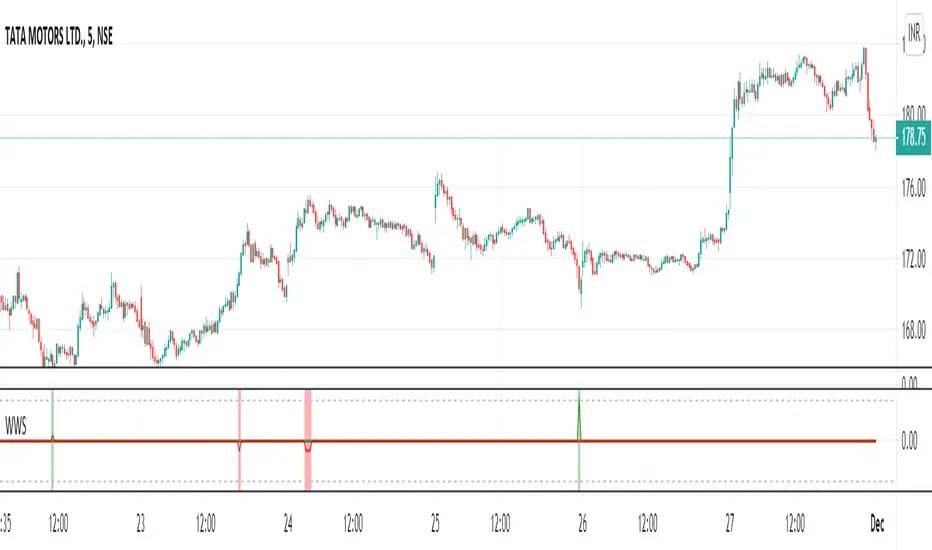 The higher/lower the peaks, the bigger the wave - green for buy and red for sell. The peak show the 5th point of Wolfe Waves .
