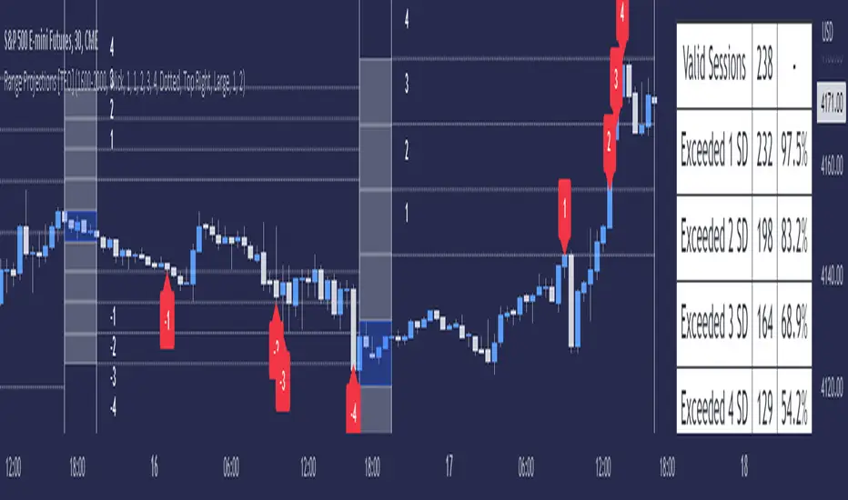 The purpose of this indicator is to see how often price reached certain standard deviations from a selected time range. The inspiration for this was to study ICT (Inner Circle Trader) concepts regarding the Central Bank Dealer’s Range (CBDR), which is 2:00 pm - 8:00 pm New York local time according to ICT Core Content. However, the idea and data collection could certainly be applied to any range of time.
