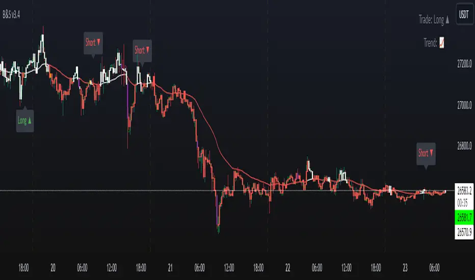 The "B&S" strategy uses RMA which is the same moving average used by the RSI, as they cross they give us an entry signal, be it a buy or sell, as the entry signal the script will color as bars according to the signal.