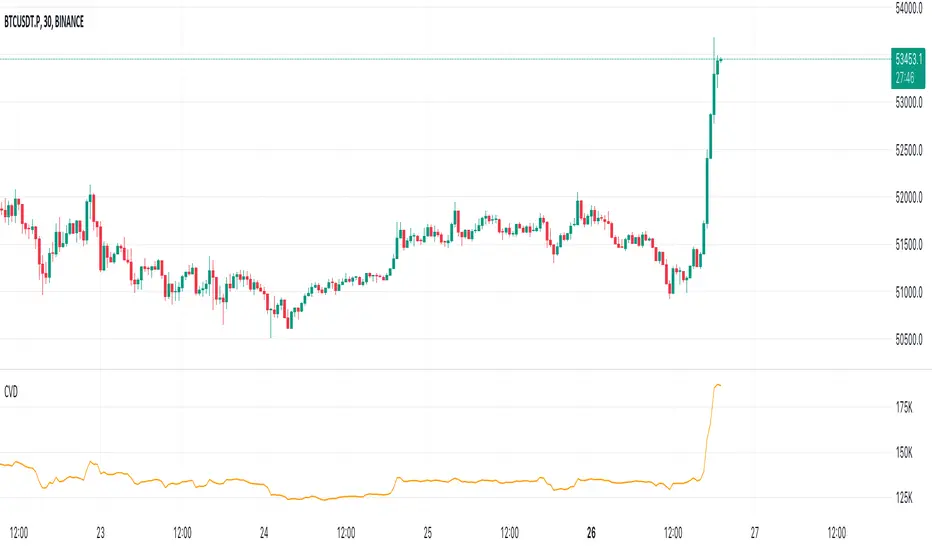 Cumulative Volume Delta (CVD) is a volume-based trading indicator that provides a visual representation of market buying and selling pressure by calculating the difference in traded volumes between the two sides. It uses intrabar information to obtain more precise volume delta information than methods using only the chart's timeframe.