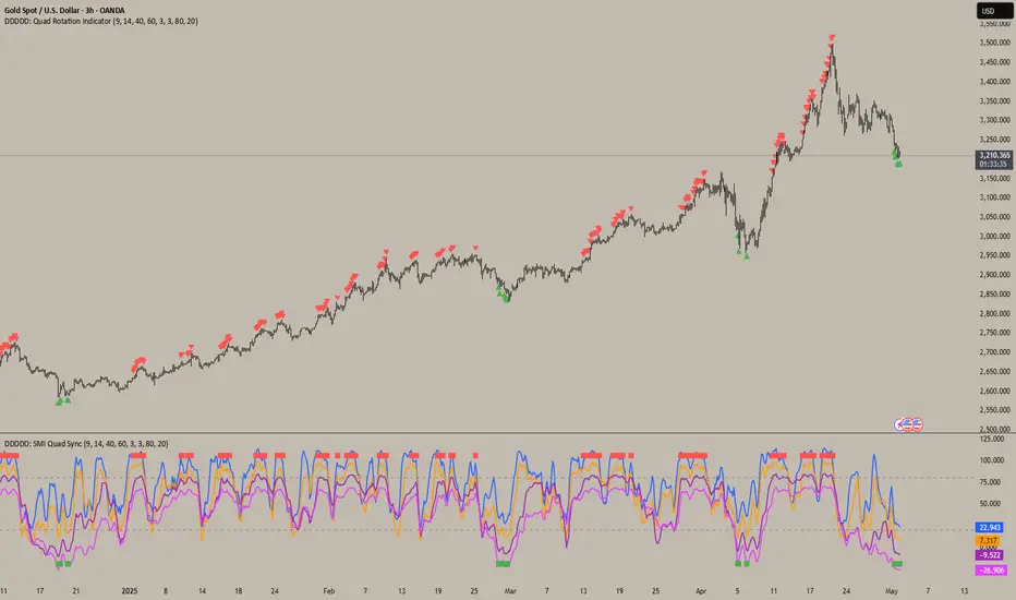 A multi-timeframe momentum synchronization indicator using 4 Stochastic Oscillators with different lengths (9, 14, 40, 60) to detect collective oversold and overbought zones.