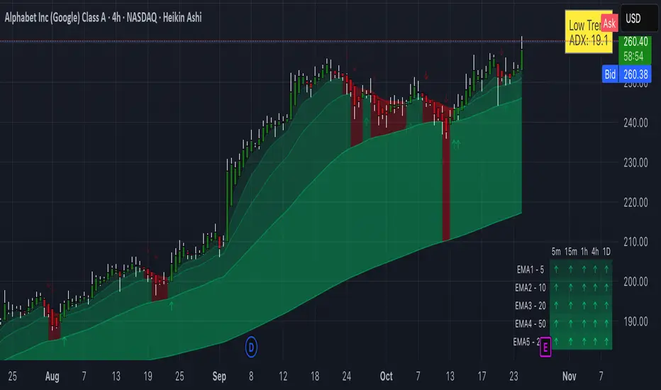 Trend Confirmation: Look for alignment where most EMAs in higher timeframes are ↑ (bullish) or ↓ (bearish).