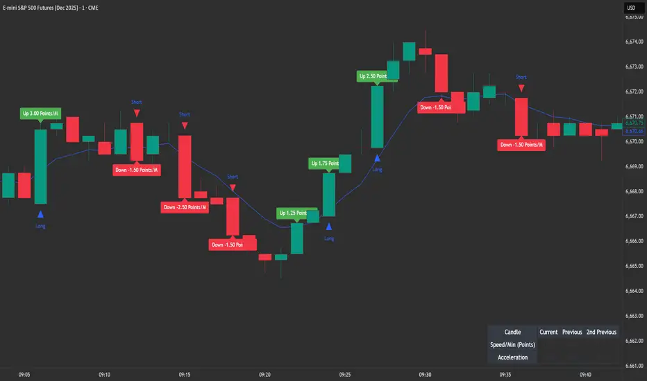 Acceleration Measurement: Tracks the change in speed between consecutive candles, offering an additional layer of momentum analysis.