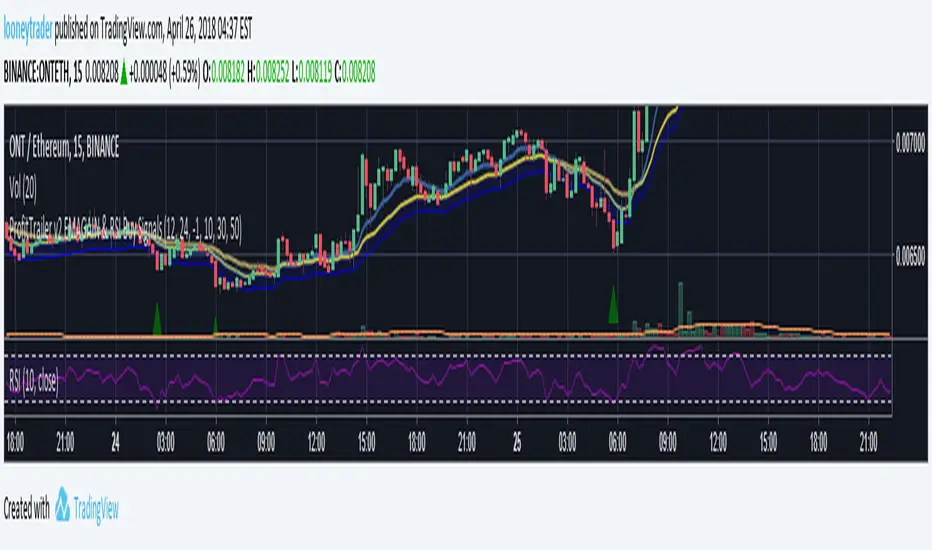 Use this script to tweak and visualize your ProfitTrailer v2 EMAGAIN + RSI buy strategy. The indicator will show you when the bot will buy based on your inputs.