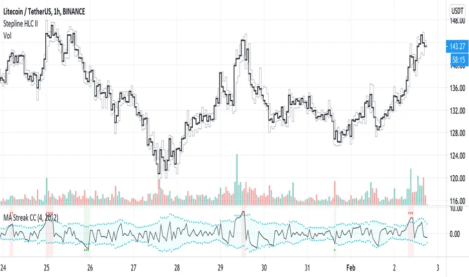Change Channel is like KC unless it uses percentage changes in price to set channel distance. Midline is zero-lag smoothed ROC with dynamic period based on MA Streak indicator, if MA Streak shows an ongoing trend, midline going strong and break out the channel.