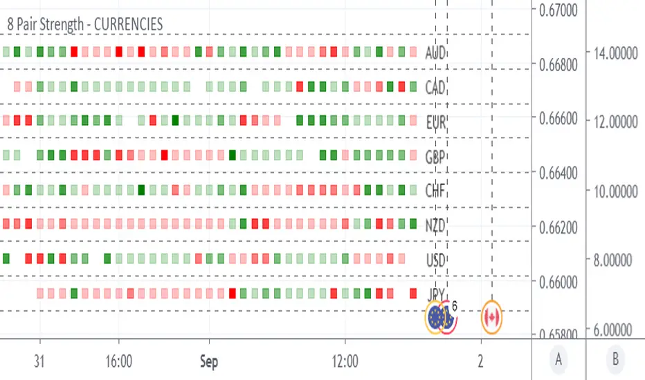 This is a stripped down version of the "8 Pair Strength - updated by rmireland for CHF/ EUR/GBP" and "8 Pair Strength - updated by rmireland for AUD/CAD / NZD/USD"