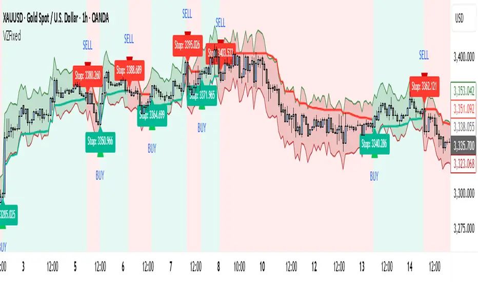 It is an ATR-based volatility indicator that combines dynamic volatility bands, a Volatility Stop line (VStop), and volatility spike detection into a single tool.