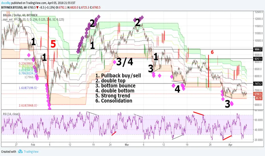 //6. Overall trends - the triangles on top or bottoms show overall general trend. Also the murrey bands act like bollinger bands, once trend changes, expect targets