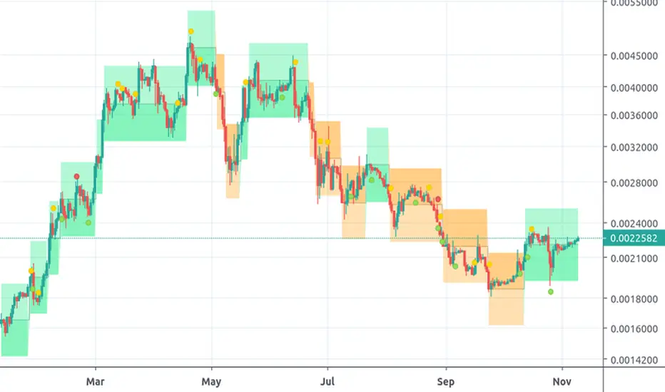 Now, each time.period has a different box size. When you change the time period of the chart, the box size adapts. Thus, you don't end up with a fullscreen filled color. The middle divider line of the box is a resistance/support line most of the time. This resistence/support has a tendency to flip. Support becomes resistance vice versa...